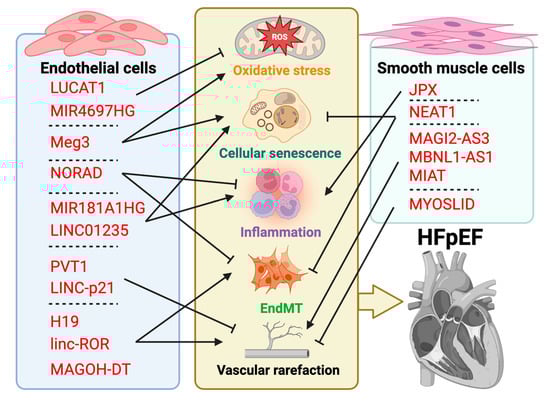 Heart failure (HF) with preserved ejection fraction (HFpEF) is emerging as one of the most prevalent and therapeutically challenging forms of HF [1,2], particularly among aging populations with a high burden of metabolic and inflammatory comorbidities. In contrast to heart failure with reduced ejection fraction (HFrEF), which is typically driven by primary myocardial injury, HFpEF is increasingly understood as a systemic syndrome rooted in vascular dysfunction, chronic low-grade inflammation, and impaired cardiometabolic homeostasis [3]. Importantly, recent research has highlighted that noncoding RNAs (ncRNAs) play critical regulatory roles in both HFrEF and HFpEF pathophysiology, influencing processes ranging from myocardial remodeling and fibrosis in HFrEF to endothelial dysfunction, inflammation, and vascular aging in HFpEF.