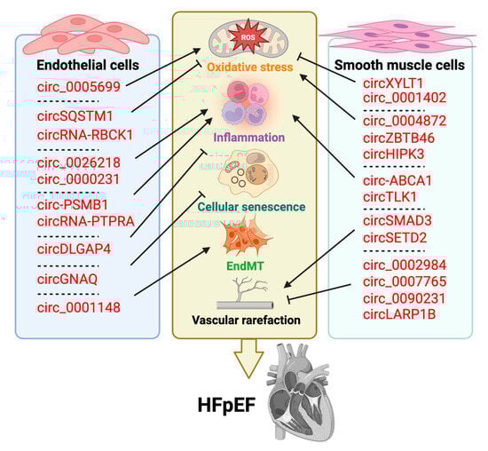 The role of circRNAs in endothelial cells and smooth muscle cells in vascular aging and HFpEF. Created in Biorender. Chen, J. (2025) https://BioRender.com/pz7k8d5.