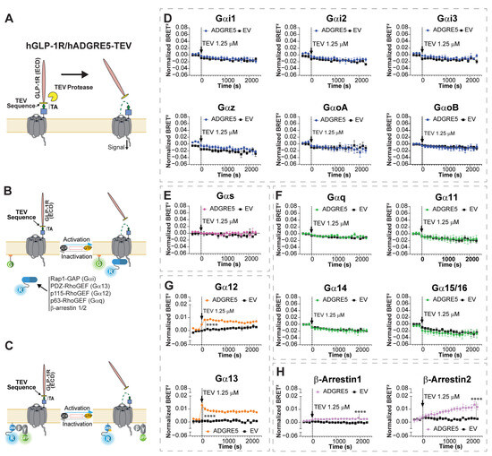 We first validated the functionality of the ebBRET-based sensors using well-characterized GPCRs and their specific ligands (Figure S1). We then treated hGLP-1R/hADGRE5-TEV chimera-expressing cells with 1.25 µM of TEV protease. No change in BRET signals was observed for the Gαi/o family G proteins, Gαs, nor Gαq/11 G proteins following TEV protease treatment (Figure 1D–F). In contrast, an increase in the BRET signals indicating coupling to Gα12 and Gα13 was observed (Figure 1G). Of note was that TEV protease had no effect on cells not expressing the hGLP-1R/hADGRE5-TEV chimera (empty vector (EV) controls) (Figure 1, black lines).