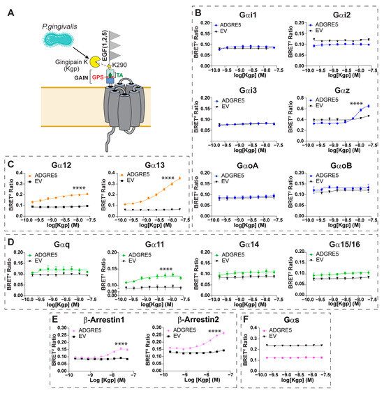Gingipain K-induced proteolysis of hADGRE5 generates a distinct signaling profile relative to cleavage at the GPS. (A) Schematic representation of the topology of hADGRE5, highlighting the site (K290; yellow star) at which Gingipain K (Kgp) cleaves the receptor. (B–F) Concentration response curves after Kgp-induced activation of different Gαi/o family G proteins (B), Gα12/13 (C), Gαq family G proteins (D), β-Arrs (E), and Gαs (F). G protein responses were measured 10 min after Kgp addition, while β-Arr data was collected 30 min after Kgp addition. In (B–E), an increase in the signal denotes pathway activation; in contrast, activation of Gαs (F) is denoted by a decreased BRET signal. As a negative control (black line), cells transfected with an empty vector (EV) were subjected to the same conditions as hADGRE5-expressing cells. Data are represented as the mean values ± SEM of 3 independent experiments. Kgp dose–response curves for EV- and hADGRE5-transfected cells were generated using the log (agonist) vs. response—variable slope (four parameters) non-linear regression model. Curves were compared statistically using the Extra Sum-of-Squares F test, which determines if the best-fit values of various parameters differ between the hADGRE5 and EV curves. **** p < 0.0001.