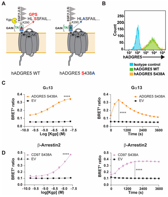 The GAIN domain of aGPCRs and exposure of the TA following NTF dissociation and/or rearrangement are thought to drive receptor activation [19]. Because GPS autoproteolysis enables movement within the GAIN domain, disrupting this cleavage could clarify how Kgp mediates hADGRE5 activation. We therefore generated a hADGRE5 S438A mutant, replacing the GPS P1′serine with alanine to block GPS autocleavage (Figure 3A) [49]. We first compared the cell surface expression of hADGRE5 WT and the autocleavage-deficient mutant by flow cytometry and found both constructs were expressed at identical levels (Figure 3B). We next examined the pathways most robustly activated by Kgp cleavage of hADGRE5 WT, namely Gα13 and β-Arr2. In hADGRE5 S438A-expressing cells, Kgp induced a dose-dependent activation of both pathways (Figure 3C,D, left). Interestingly, whereas the Gα13 response was comparable to WT (Figure 3C left vs. Figure 2C right), β-Arr2 recruitment was enhanced in the autocleavage-deficient mutant (Figure 3D left vs. Figure 2E right). The Gα13 activation kinetics matched those observed with the WT receptor (Figure 3C right vs. Figure S2C right), but β-Arr2 recruitment occurred faster in the S438A mutant, reaching WT maximal levels earlier (Figure 3D right vs. Figure S2D right).