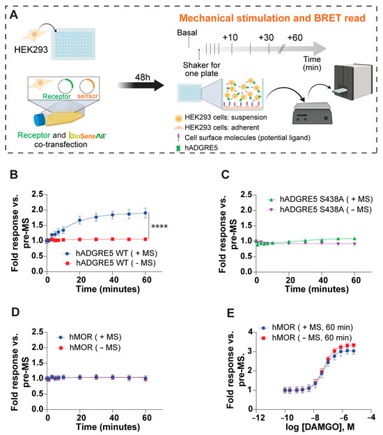 In vivo, aGPCRs are believed to serve as mechanosensors that convert extracellular mechanical cues into intracellular signaling [50,51,52,53]. To better understand if and how hADGRE5 is activated through mechanical stimulation (MS) [54], we developed an in cellulo BRET-based assay (MS-BRET) where cells co-transfected with hADGRE5 and the β-Arr2 engagement biosensor were subjected to vigorous MS on an orbital shaker (Figure 4A). The β-Arr2 engagement biosensor was selected as a readout since it generated a robust and persistent signal with the previous activation strategies. Figure 4B shows that cells transfected with hADGRE5 and subjected to MS exhibit a robust and sustained recruitment of β-Arr2 to the PM. No change in BRET was observed in the absence of MS. To test whether GPS autoproteolysis contributes to MS-induced activation, we applied the MS-BRET assay to cells expressing the S438A mutant. The mutation abolished β-Arr2 recruitment following MS (Figure 4C), indicating that GPS cleavage (and possibly TA exposure) is required for MS-driven signaling.