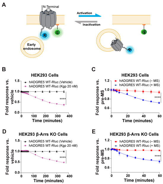 GPCR activation is frequently followed by receptor endocytosis, a process mediated by various cellular mechanisms. Among these, β-Arrs are the most well-characterized mediators of receptor internalization [55,56]. To evaluate whether Kgp- or MS-induced activation of hADGRE5 leads to receptor internalization, we used a BRET receptor trafficking assay comprising a Rluc-tagged version of hADGRE5 and a PM-anchored rGFP. Receptor internalization produces a decrease in the BRET signal (Figure 5A). As shown Figure 5B, Kgp-induced hADGRE5 cleavage led to a significant reduction in BRET relative to vehicle-treated cells. Similarly, receptor internalization was detected in hADGRE5-expressing cells subjected to MS, while no significant reduction in BRET signal was observed in cells not subjected to MS (Figure 5C). To further validate the MS-induced internalization of hADGRE5, we repeated the assay with a Rluc-tagged version of the somatostatin hSST2A receptor. The hSST2A receptor is not known to respond to MS but internalizes following binding to somatostatin. Indeed, no change in BRET was seen with MS, but hSST2A-Rluc internalized upon stimulation with somatostatin-14 (SST-14) (Figure S4).