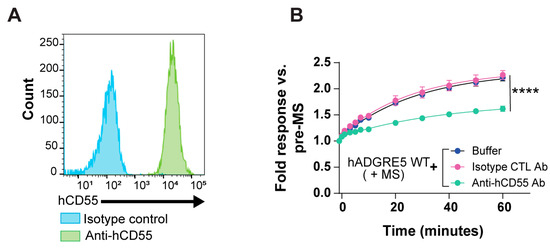 Studies have demonstrated that ADGRE5 and its ligand CD55 are co-expressed in cells of several tumor types. This interaction has been associated with tumor progression and increased aggressiveness [57,58,59,60,61]. Importantly, the hADGRE5 isoform 2-hCD55 complex was shown to display mechanical force-resisting shearing stretch geometry, potentially enabling a mechanosensing mechanism for hADGRE5 activation and signaling [62]. We thus investigated whether the interaction of hADGRE5 with CD55 is implicated in mediating β-Arr2 recruitment in our MS-BRET assay. First, we used flow cytometry to confirm that CD55 is expressed on the surface of our HEK293 cells (Figure 6A). We then assessed MS-mediated β-Arr2 recruitment in hADGRE5 expressing cells in the presence of a neutralizing antibody that prevents CD55`s interaction with hADGRE5. Cells were also treated with an isotype control antibody alone as a specificity control of the CD55 neutralizing antibody. Our results showed a significant reduction in the BRET signal in the presence of the CD55 neutralizing antibody compared with control conditions (Figure 6B), indicating that CD55 participates in the MS-mediated recruitment of β-Arr2 to hADGRE5.