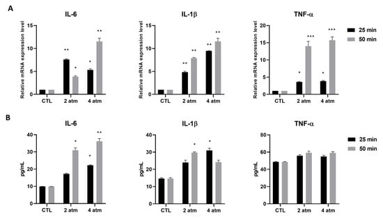 Effects of the hyperbaric environment on cytokine expression in the MG-63 cell line. Cells were cultured in a normobaric (CTL) or hyperbaric environment in the hyperbaric chamber at 2 and 4 atm for 25 and 50 min. After treatments, (A) mRNA was extracted and analyzed by RT-PCR. IL-6, IL-1β, and TNF-α mRNA levels were reported as relative mRNA expression levels with respect to 18S mRNA (2−∆∆Ct method). (B) Cell supernatants were collected and analyzed by ELISA to determine the IL-6, IL-1β, and TNF-α amounts. The results are reported as pg/mL. Results are expressed as mean ± standard deviation (SD) of data obtained by three independent experiments. * p < 0.05, ** p < 0.01, *** p < 0.005 treated cell (hyperbaric conditions) vs. CTL (normobaric conditions).
