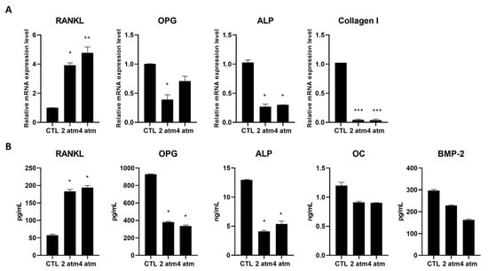 The same conditions used to analyze MG-63 were applied to study hOBs, selecting a single exposure time, 25 min. The hOBs produced RANKL, both at the mRNA and protein level, at 2 atm and 4 atm for 25 min (Figure 5A,B). OPG decreased both at the mRNA and, to a greater extent, at the protein level (Figure 5A,B). Moreover, alkaline phosphatase (ALP) was measured both at the mRNA and protein level, finding that the hyperbaric conditions used induced a statistically significant decrease in this factor (Figure 5A,B). Collagen type I is the main type of collagen present in the bone extracellular matrix; thus, we analyzed its production and found that the exposure at 2 atm and 4 atm caused a marked decrease (Figure 5A). Finally, we measured the production of Osteocalcin (OC) and Bone Morphogenetic Protein-2 (BMP-2) at the protein level, finding both decreased by treatment, although not statistically significantly (Figure 5B).