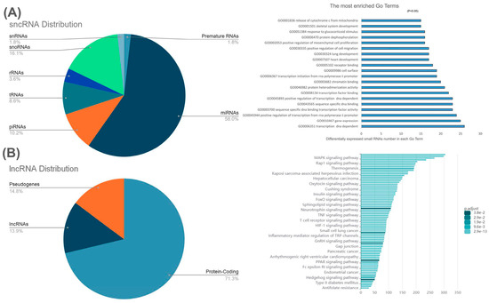Pie charts depicting the relative percent of different classes of ncRNAs in fibroids based on NGS data (GSE100338) [90] and (GSE224991) [32]. The pie charts represent (A) relative proportion of DEsncRNAs (>1.5-fold difference) between fibroids and matched Myo, along with the associated pathways they may regulate to the right and (B) the relative proportion of DElncRNAs (>1.5-fold difference) between fibroids and matched Myo, along with the associated pathways they may regulate to the right. Note that in (B), the category “Other” refers to DElncRNAs that were not classified as intergenetic, intronic, antisense, or processed lncRNAs.
