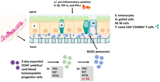 Cord blood (CB) samples were collected during healthy full-term deliveries with written informed consent and approval by the Ethics Committee of the Medical University of Graz (approval date: July 2014). Mononuclear cells were isolated from cord blood samples within 10 h of collection using a discontinuous density gradient centrifugation with Ficoll/Hypaque. Subsequently, CD34+ hematopoietic stem and progenitor cells were purified from the mononuclear cell fraction using the EasySep™ Human Cord Blood CD34 Positive Selection Kit II (STEMCELL Technologies, Cologne, Germany), following the manufacturer’s instructions. The purity of isolated CD34+ cells was routinely >90%, as confirmed by flow cytometry. After isolation, cells were expanded for 3 days in X-VIVO™ 15 Medium (Lonza) supplemented with 1% GlutaMAX, 1% PenStrep, and 50 ng/mL stem cell factor (SCF), Fms-related tyrosine kinase 3 ligand (FLT3-L), and thrombopoietin (TPO) before they were used for the setup of the small intestinal model.