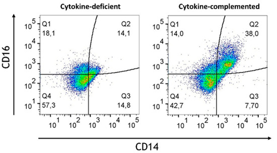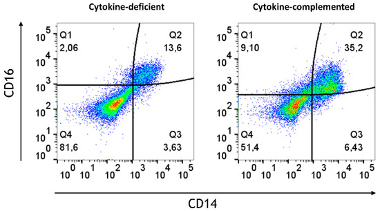 Increased intermediate monocytes in the cytokine-complemented model. Dot plots representing CD11b+ cells in the cytokine-complemented vs. cytokine-deficient (control) model. Plots depict CD16 expression levels in % vs. CD14 expression levels in %; data are pooled from 4 experiments; for each experiment, a different CD34+ and CD4+ T cell donor was used (biological replicates: n = 4). These three markers are typically expressed by monocytes and also serve to further subclassify the monocyte subsets. Q1 = CD11b+CD16+ (non-classical/patrolling monocytes; Q2 = CD11b+CD14+CD16+ (intermediate monocytes); Q3 = CD11b+CD14+ (classical monocytes); Q4 = CD11b+.