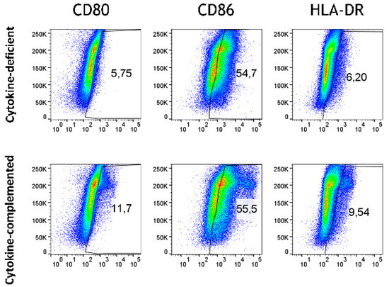 Beyond differentiation, the expression of APC activation markers was analyzed in both models. Whereas in the cytokine-deficient condition, low levels of APC activation markers, including CD80, CD86, and HLA-DR, were detected, the cytokine-complemented model led to an increase in CD80+ CD86+ HLA-DR+ cells, indicative of heightened antigen presentation capacity (Figure 4 and Figure 5).