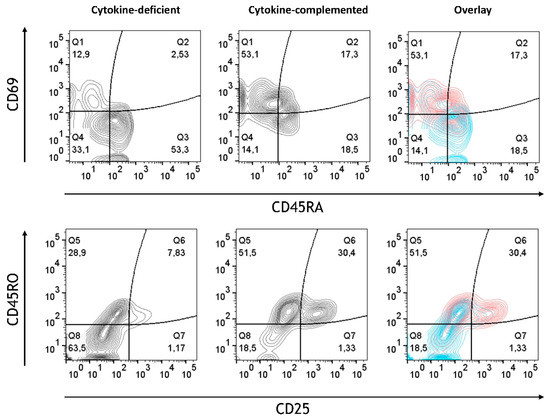 T cell activation in cytokine-deficient vs. cytokine-complemented model. Dot plots representing CD4+ T cells in the healthy vs. control model. Plots depict CD69 expression levels in % vs. CD45RA expression levels in % as well as CD45RO expression levels in % vs. CD25 expression levels in %; data are pooled from 4 experiments; for each experiment, a different CD34+ and CD4+ T cell donor was used (biological replicates: n = 4).