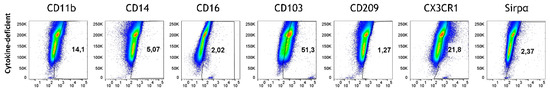 Exposing dye-labeled M/DC precursor cells to epithelial cells in the 3D intestinal model for extended periods of time did not result in the induction of M/DC marker characteristics (Figure 2, upper panel, “cytokine-deficient”). Only minor percentages of cells acquired CD11b, CD14, CD16, and Sirpα, and other macrophage/DC markers (CD103, CD209, CXRCR1) were not detected. This reductionist approach permitted us to introduce additional intestinal factors to the 3D epithelial/T cell model, such as pro-inflammatory cytokines and RA priming of M/DC precursors.
