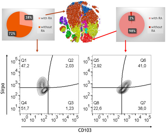 Phenotypic analysis via FlowJo. tSNE analysis followed by clustering of flow cytometry data for the RA-treated model and the untreated model; data (105 PKH+ cells from RA-treated model and untreated control) are pooled from 4 experiments; for each experiment, a different CD34+ and CD4+ T cell donor was used (biological replicates: n = 4). Pie charts showing the distribution (in %) of the RA-treated versus untreated model. Expression of Sirpα and CD103 is shown in two selected FACS representing CD11b+.