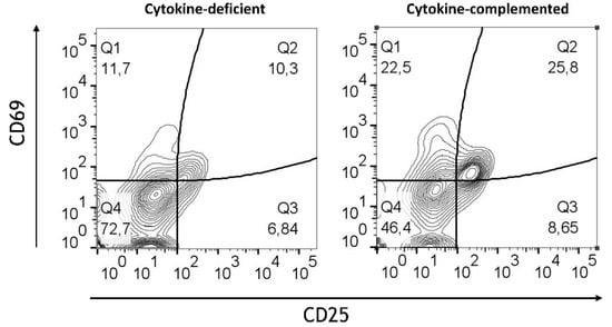 T cell activation in cytokine-deficient vs. cytokine-complemented models. Dot plots representing CD4+T CD45RO+ cells in the healthy vs. control models. Plots depict CD69 expression levels in % vs. CD25 expression levels in %; data are pooled from 4 experiments; for each experiment, a different CD34+ and CD4+ T cell donor was used (biological replicates: n = 4).