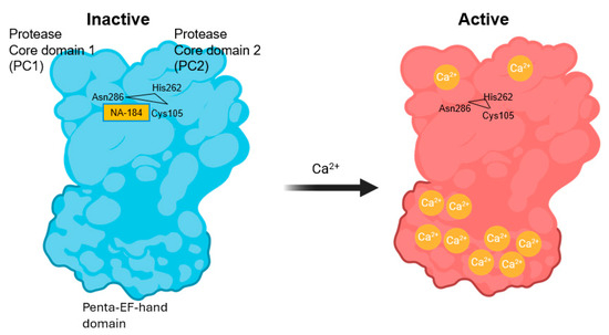 Schematic representation of the activation of calpain by calcium. In the absence of calcium, calpain-1/2 is in an inactive state and the catalytic triad located between Protease Core domain 1 (PC1) and Protease Core domain 2 (PC2), Cys105/His262/Asn286, is not functional (left); this panel also shows the binding sites of NA184. Upon binding of 10 calcium ions to various sites of the Penta–EF–hand domains and PC1 and PC2 domains, the catalytic triad becomes functional (right).