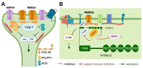 All the data are, therefore, consistent with the notion that, in the brain at least, calpain-1 and calpain-2 play opposite functions in synaptic plasticity and learning and memory as well as in neuroprotection/neurodegeneration [121,122]. Obviously, a critical question concerns the potential mechanism(s) that could account for these opposing functions. One of the mechanisms we identified is related to the different targets for calpain-1 and calpain-2. Thus, calpain-1 activation results in the cleavage and inactivation of SCOP, a negative regulator of ERK, and PI3-Akt, a pro-survival kinase [112,123]. On the other hand, calpain-2 degrades and inactivates STEP, resulting in the activation of p38 and downstream cell death signaling pathways [110,124,125]. Another mechanism we identified was provided by the existence of different (PSD-95/Dlg/ZO-1) (PDZ) binding domains in the C-terminal domains of calpain-1 and calpain-2 [121]. We postulated that these domains result in the association of calpain-1 and calpain-2 with different signaling pathways—involved in neuroprotection and synaptic plasticity for calpain-1, and in opposing synaptic plasticity and stimulating neuronal damage for calpain-2 [88,122,126] (Figure 2). Calpain-1 is likely to be associated with PSD-95, which also binds the NMDA receptors, as well as neuronal nitric oxide synthase (nNOS) and PHLPP1 [127] (Figure 2A). Interestingly, all the members of the calpain family exhibit a PDZ binding domain in their C-terminal domains, which suggests that they are all associated with distinct signaling pathways [88]. In searching for a PDZ binding partner for calpain-2, we identified tyrosine phosphatase, PTPN13—also known as Fas-Associated Protein 1 (FAP1)—a negative regulator of apoptosis [128]. Importantly, PTPN13 is selectively cleaved and inactivated following calpain-2 activation, resulting in the activation of downstream signaling pathways, including apoptosis and various protein kinases, such as c-Abl (Figure 2B). This pathway could account for the abnormal tau phosphorylation observed following TBI [128]. Moreover, a fragment of PTPN13 with a molecular weight of about 130 kD leaks into the blood and its levels were found to be correlated with the degree of injury following TBIs in both mice and humans [129]. Interestingly, PTPN13 has five PDZ binding domains and also binds PIP2 and PTEN in addition to calpain-2 [130,131,132] (Figure 2B). This could account for the activation of calpain-2 following stimulation of extrasynaptic NMDA receptors—resulting in the truncation of PTEN and PTPN13—as well as in the autolysis of calpain-2—resulting in the prolonged activation of calpain-2—which has been shown following TBI or status epilepticus [118,120].