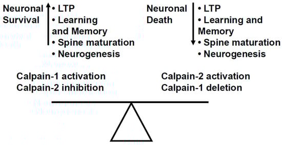 The balance between calpain-1 and calpain-2 activity plays a critical role in neuronal homeostasis. Calpain-1 activation and calpain-2 inhibition result in enhanced LTP and learning and memory, enhanced dendritic spine maturation, neuronal survival, and enhanced neurogenesis. On the other hand, calpain-2 activation and calpain-1 deletion/inhibition result in opposite functions, i.e., neuronal death, decreased LTP and learning and memory, inhibited spine maturation, and inhibited neurogenesis.