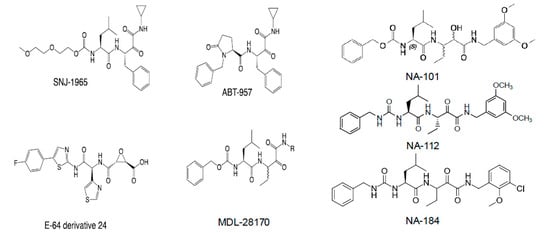 - Siklos, M.; BenAissa, M.; Thatcher, G.R. Cysteine proteases as therapeutic targets: Does selectivity matter? A systematic review of calpain and cathepsin inhibitors. Acta Pharm. Sin. B 2015, 5, 506–519. [Google Scholar] [CrossRef]
