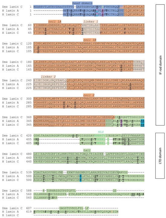 Multiple sequence alignment for A-type lamins from Drosophila melanogaster (Dme) and Homo sapiens (H), with a particular focus on the lamin structural elements and their similarity between sequences. Alignment prepared using Clustal Omega (clostalo 1.2.4 online version; https://www.ebi.ac.uk/Tools/msa/clustalo/ (accessed on 19 March 2022) with the default algorithm). Sequences, structural regions, and motifs were downloaded from the UniProt and iPTMnet phosphorylation motif databases (validated on 15 February 2021). Description of color marks and symbols used in alignments: S, T, and Y—bolded and underlined amino acids depict the phosphorylation site according to UniProt and iPTMnet databases. S, T, and Y—bolded amino acids depict the phosphorylation sites according to iPTMnet with additional data sources: phospho.ELM, PhosphoSitePlus, and Human Protein Reference Database (HPRD). S—confirmed experimentally, in the case that the UniProt database lacks information about this particular site; S (yellow and underlined)—experimentally confirmed but not annotated in the UniProt database; red C—S-farnesyl cysteine site. Phosphorylation sites: cyclin-dependent kinase 1 phosphorylation site (Cdk1)—purple; protein kinase C alpha type phosphorylation site (PKCα)—cyan. Changes in lamin isoforms from interphase to M-phase isoforms are connected with phosphorylation and dephosphorylation events [52,76,78,80,81,137,138]. Lamina disassembly and nuclear envelope disassembly are correlated with lamin phosphorylation caused by Cdk1 protein kinase and protein kinase C [78,139,140,141]. Notably, the N-terminal Cdk1 phosphorylation site at S37 plays an important role in lamin C polymerization and solubility. The impact of the S37L mutation on Drosophila larval muscle structure further underscores its functional significance (see Table 2) [52,142].