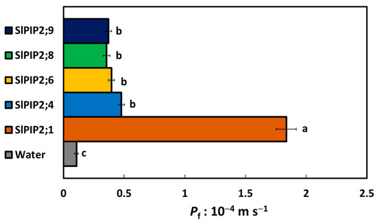 Water transport activity of SlPIP2s. Pf was determined from swelling assay using X. laevis oocytes. Oocytes were injected with 10 ng of SlPIP2s cRNA, while those injected with nuclear-free water served as negative controls. Following injection, oocytes were incubated at 18 °C for 24 to 48 h in MBS before the experiments were conducted. All SlPIP2 isoforms (SlPIP2;1, SlPIP2;4, SlPIP2;6, SlPIP2;8, and SlPIP2;9) significantly increased Pf compared to those injected with water. Statistical significance (p < 0.05) was assessed using one-way ANOVA followed by Tukey’s HSD test, with different letters denoting significant differences. Data are means ± SE (n = 12–18).