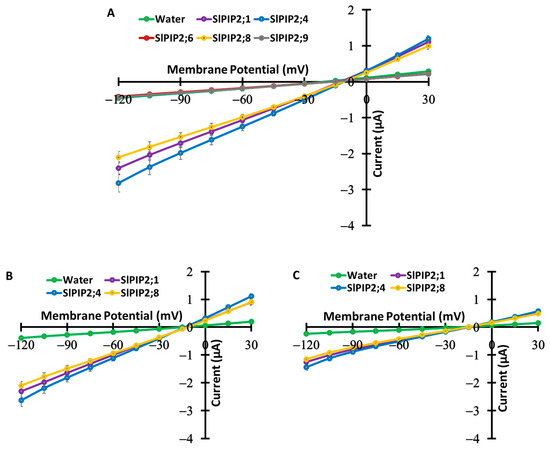 To assess the ion transport activity of SlPIP2s, TEVC experiments were performed using X. laevis oocytes expressing SlPIP2 isoforms (SlPIP2;1, SlPIP2;4, SlPIP2;6, SlPIP2;8, and SlPIP2;9). The results revealed that only SlPIP2;1, SlPIP2;4, and SlPIP2;8 elicited large, bidirectional, and voltage-independent currents (−2.41 ± 0.18 µA, −2.82 ± 0.25 µA, and −2.10 ± 0.16 µA at −120 mV) in a bath solution containing 86.4 mM NaCl, 9.6 mM KCl, and 30 µM free-Ca2+ (low Ca2+ condition). In contrast, SlPIP2;6 and SlPIP2;9 did not exhibit significant currents (−0.41 ± 0.03 µA and −0.43 ± 0.04 µA at −120 mV) compared to water-injected oocytes (−0.46 ± 0.04 µA at −120 mV) (Figure 2A). Under low Ca2+ conditions, SlPIP2;1, SlPIP2;4, and SlPIP2;8 exhibited ionic conductance values of 22.7 µS, 26.8 µS, and 18.7 µS, respectively. In contrast, water-injected oocytes, along with SlPIP2;6 and SlPIP2;9, displayed significantly lower conductance levels of 4.40 µS, 4.00 µS, and 4.10 µS, respectively (Supplementary Table S4). Furthermore, when the external Ca2+ concentration increased to 1.8 mM (high Ca2+ condition), the currents associated with SlPIP2;1, SlPIP2;4, and SlPIP2;8 were reduced compared to those in low Ca2+ conditions (Figure 2B,C). Specifically, the ionic conductance of SlPIP2;1, SlPIP2;4, and SlPIP2;8 was 21.9, 26.1, and 19.8 µS, respectively, under low Ca2+ conditions, whereas it decreased to 13.8, 16.8, and 13.0 µS in high Ca2+ conditions. These values were significantly higher than those of water-injected oocytes, which exhibited conductance of 3.65 µS in low and 2.37 µS in high Ca2+ conditions (Supplementary Table S4).