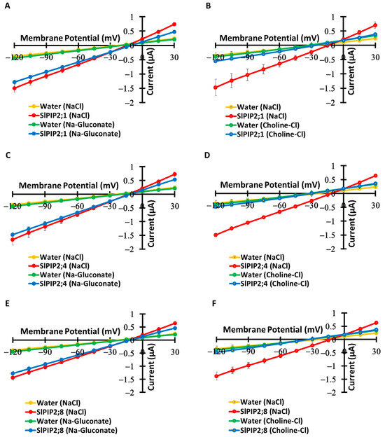 To investigate the influence of external anions, specifically Cl−, on ion transport through SlPIP2s (SlPIP2;1, SlPIP2;4, and SlPIP2;8), oocytes were exposed to bath solutions containing 96 mM NaCl, 96 mM Na-gluconate, and 96 mM Choline-Cl (Figure 3). Current–voltage recordings showed that the oocytes expressing SlPIP2;1, SlPIP2;4, and SlPIP2;8 responded with similar currents regardless of whether Cl− (−1.49 ± 0.14 µA—Figure 3A, −1.66 ± 0.19 µA—Figure 3C, −1.44 ± 0.09 µA—Figure 3E at −120 mV) or gluconate (−1.28 ± 0.07 µA—Figure 3A, −1.48 ± 0.09 µA—Figure 3C, −1.27 ± 0.07 µA—Figure 3E at −120 mV) was present. The reversal potential remained unchanged across the different solutions, indicating that Cl− does not significantly influence the currents mediated by SlPIP2s. In the presence of 96 mM Choline-Cl, oocytes expressing the SlPIP2;1, SlPIP2;4, and SlPIP2;8 generated only small currents (−0.55 ± 0.04 µA—Figure 3B, −0.48 ± 0.03 µA—Figure 3D, −0.49 ± 0.02 µA—Figure 3F at −120 mV), which were similar to the currents observed in water-injected controls (−0.39 ± 0.05 µA at −120 mV) and notably lower than those seen in the presence of 96 mM NaCl (−1.48 ± 0.29 µA—Figure 3B, −1.49 ± 0.06 µA—Figure 3D, −1.38 ± 0.15 µA—Figure 3F at −120 mV). A shift in the reversal potential was observed among the different solutions, indicating that the Na+-induced currents mediated by SlPIP2s are independent of Cl− concentration. Additional experiments, which used solutions containing either 9.6 mM NaCl or 86.4 mM Na-gluconate (giving a total Na+ concentration of 96 mM), as well as 9.6 mM NaCl or 86.4 mM Choline-Cl (where the Na+ concentration was 9.6 mM), confirmed that a shift in the reversal potential occurred with reduced Na+ concentration, as predicted by the Nernst equation. This data further supports the conclusion that Cl− does not influence SlPIP2s-mediated ion currents (Supplementary Figure S2).
