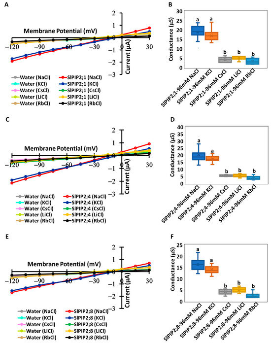 Ion conductance and selectivity of monovalent alkaline cations in SlPIP2;1, SlPIP2;4, and SlPIP2;8. Current–voltage relationships were recorded from X. laevis oocytes expressing SlPIP2;1 (A), SlPIP2;4 (C), SlPIP2;8 (E), or injected with water as a control. The results indicate that SlPIP2;1, SlPIP2;4, and SlPIP2;8 exhibit distinct selectivity for monovalent alkaline cations. Oocytes were sequentially exposed to bath solutions containing low calcium (30 µM free-Ca2+) and supplemented with 96 mM of Na+, K+, Cs+, Rb+, or Li+ (as chloride salts). The ionic conductance of SlPIP2;1 (B), SlPIP2;4 (D), and SlPIP2;8 (F) expressing oocytes was measured over a membrane potential range from −75 mV to −120 mV. Each oocyte was injected with 10 ng of SlPIP2;1, SlPIP2;4, or SlPIP2;8 cRNA. SlPIP2 isoforms exhibit selective permeability to Na+ and K+, but no Cs+, Li+, or Rb+ transport. Significant differences (p < 0.05) were identified through one-way ANOVA with Tukey’s HSD test and are represented by distinct letters. Data are means ± SE (n = 5–15).