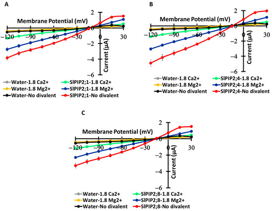 SIPIP2;1, SIPIP2;4, and SIPIP2;8 exhibit different ion transport activity in response to divalent cations (Ca2+ and Mg2+) (Figure 5). In the absence of divalent cations, all three isoforms display higher ion transport. When Ca2+ is present (1.8 mM), ion transport is significantly reduced, suggesting an inhibitory effect of Ca2+ on these AQPs. Mg2+ also decreases ion transport, but to a lesser extent than Ca2+. In the presence of 1.8 mM Ca2+, oocytes expressing SlPIP2;1, SlPIP2;4, and SlPIP2;8 exhibited relatively small currents of −1.29 ± 0.09 µA (Figure 5A), −1.41 ± 0.05 µA (Figure 5B), and −1.17 ± 0.04 µA (Figure 5C), respectively, at −120 mV. When 1.8 mM Mg2+ was replaced with Ca2+, the currents increased to −2.73 ± 0.24 µA for SlPIP2;1 (Figure 5A), −3.04 ± 0.18 µA for SlPIP2;4 (Figure 5B), and −2.28 ± 0.09 µA for SlPIP2;8 (Figure 5C) at the same membrane potential. The highest current values were recorded under conditions without divalent cations, reaching −3.84 ± 0.25 µA (Figure 5A), −4.89 ± 0.43 µA (Figure 5B), and −3.29 ± 0.30 µA (Figure 5C) for SlPIP2;1, SlPIP2;4, and SlPIP2;8, respectively, at −120 mV. Water-injected controls show minimal changes, confirming that the observed effects are specific to SIPIP2 isoforms (Figure 5). These results suggest that Ca2+ and Mg2+ regulate ion permeability through SIPIP2s, with Ca2+ exerting a more inhibitory influence.