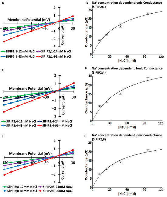 The ionic conductance of SlPIP2s (SlPIP2;1, SlPIP2;4, and SlPIP2;8) was further analyzed in rising NaCl concentrations from 12 mM to 96 mM (Supplementary Table S6) and followed by Michaelis–Menten curve fitting (Figure 6). The apparent maximum conductance (Vmax) and apparent Michaelis constant (Km) were 25.6 µS and 28.2 mM, respectively, in SlPIP2;1 (Figure 6B), SlPIP2;4 showing 24.4 µS and 25.3 mM (Figure 6D), and SlPIP2;8 displaying 22.3 µS and 24.9 mM (Figure 6F).