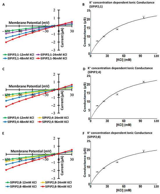 The ionic conductance of SlPIP2;1, SlPIP2;4, and SlPIP2;8 was analyzed in rising KCl, like NaCl, with concentrations ranging from 12 mM to 96 mM (Supplementary Table S7) and followed by Michaelis–Menten curve fitting (Figure 7). The apparent Vmax and apparent Km were determined as follows: 23.3 µS and 27.6 mM for SlPIP2;1 (Figure 7B), 22.9 µS and 25.9 mM for SlPIP2;4 (Figure 7D), and 20.0 µS and 23.3 mM for SlPIP2;8 (Figure 7F).