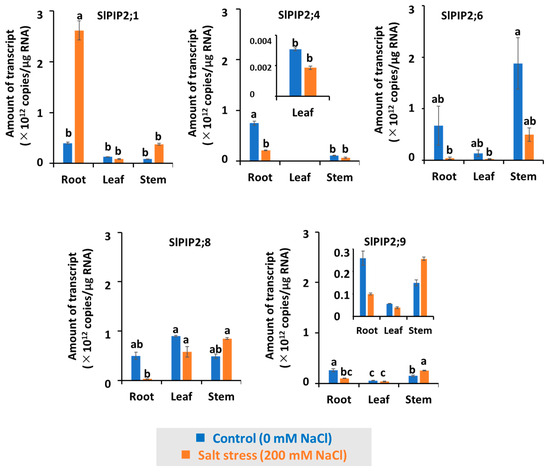 Quantification of SlPIP2s transcript levels in the Micro-Tom tomato cultivar using qPCR. Plants were grown in soil-filled pots for approximately 30 days before being divided into two treatment groups: three plants were irrigated with 200 mM NaCl in tap water, while another three received only tap water for 17 days. The transcript levels of SlPIP2s were measured in leaves, stems, and roots through absolute quantification, expressed as copies per microgram of RNA. Among the icAQPs, SlPIP2;4 and SlPIP2;8 show relatively low and stable expression levels, whereas the amount of SlPIP2;1 transcript increased significantly in roots after 17 days of 200 mM NaCl treatment. Significant differences (p < 0.05) were determined using one-way ANOVA followed by Tukey’s HSD test and are indicated by different letters. Data are means ± SE (n = 3).