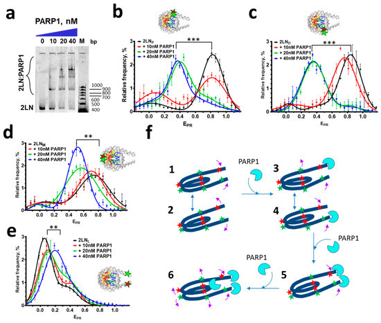 Formation of complexes of PARP1 with nucleosomes and concomitant rearrangement of nucleosome structure. (a) EMSA analysis of complexes of PARP1 with fluorescently labeled 2LN nucleosomes; M—DNA markers. (b–e) Analysis of PARP1 complexes with 2LNP (b), 2LNM (c), 2LND (d), and 2LNL (e) nucleosomes using spFRET microscopy. Averaged EPR-profiles of nucleosomes are shown (mean ± SEM, number of experiments n = 3, 2000–4000 particles in each experiment). Changes in the position of the EPR peak, t-test: *** p < 0.0005, ** p < 0.005. (f) Schematic model of interactions of PARP1 with 2LN nucleosomes. The nucleosome has at least two conformations of linker DNA helixes (states 1 and 2). The first PARP1 molecule interacts with one of the DNA ends (i.e., DSBs) of the nucleosome (complexes 3 and 4), slightly changing the conformation of nucleosomal and linker DNA. The second molecule of PARP1 interacts with the second end of DNA (complex 5). The third PARP1 molecule interacts with the nucleosome core and induces an increase in the distance between the gyres of nucleosomal DNA and a decrease in the distance between the helices of linker DNA (complex 6). Red and green asterisks mark the positions of the Cy3 and Cy5 labels. Pink arrows indicate structural changes observed as alterations in EPR (i.e., the distance between the Cy3 and Cy5 labels) for differently labeled 2LN nucleosomes.