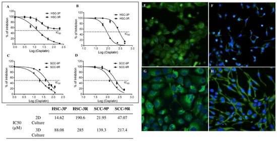 Figure 1. Determination of the IC50 concentrations for cisplatin in parental and resistant cells. Curves for HSC-3P and HSC-3R cells in 2D culture and in 3D spheroid culture are depicted in (A) and (B), respectively. (C) The IC50 curve for SCC-9P and SCC-9R cultured in monolayer (2D culture), and (D) the IC50 curve for SCC-9P and SCC-9R cultured in 3D spheroid. Fluorescence microscopy images of Phalloidin/DAPI staining of the parental and resistance cells at original magnification ×200. (E) HSC-3P, (F) HSC-3R, (G) SCC-9P, and (H) SCC-9R. All experiments were performed in triplicate and repeated at least three times. Cell viability in both 2D and 3D models was assessed using the CellTiter-Glo 3D Cell Viability assay (Promega, Madison, WI, USA) according to the manufacturer’s protocol.