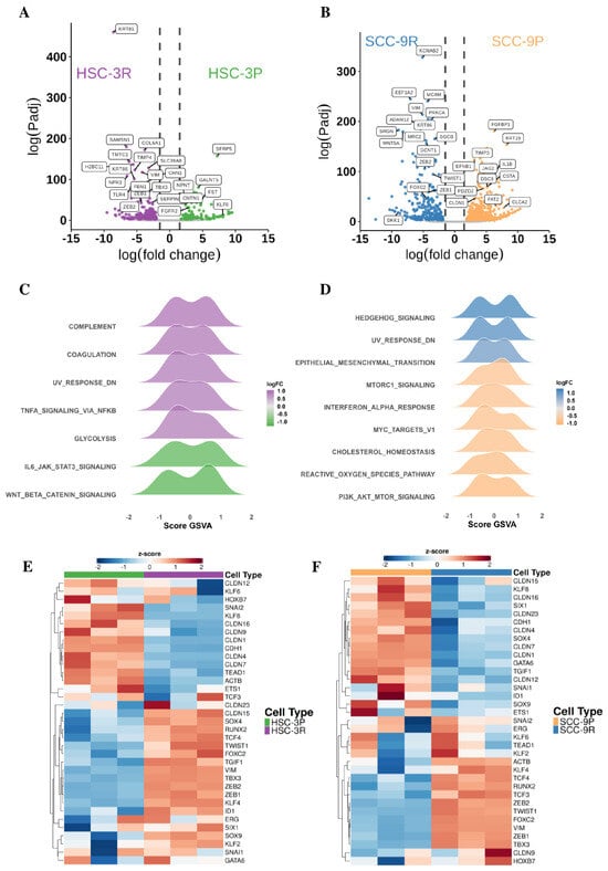 Figure 2. Identification of key genes in OSCC-resistant cells. RNA-seq volcano plot for differentially expressed genes in HSC-3P and HSC-3R cells (A) and in SCC-9P and SCC-9R cells (B). Gene set variation analysis (GSVA) for the main pathways activated in HSC-3R compared to HSC-3P (C) and in SCC-9R compared to SCC-9P (D). Heatmap of differentially expressed genes related to epithelial–mesenchymal transition in HSC-3 cells (E) and in SCC-9 cells (F).