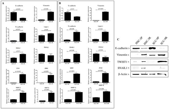Figure 3. The acquisition of cisplatin resistance triggers the activation of the EMT process in OSCC cells. (A,B) Quantitative expression analysis of EMT-related markers, including E-cadherin, Vimentin, TWIST1, N-cadherin, SNAIL1, SNAIL2, ZEB1, ZEB2, MMP-2, and MMP-9 mRNA analysis in HSC-3P/R (A) and SCC-9P/R (B). The values represent the mean ± SD of three separate experiments. The epithelial–mesenchymal shift is more pronounced in SCC-9R cells. Original magnification: ×200. (C) Western blot assay for E-cadherin, Vimentin, TWIST1, and SNAIL1 in parental and cisplatin-resistant cells. The reaction against β-actin was used as a housekeeping control. A representative blot is shown. Uniform linear adjustments to brightness and contrast were applied to the entire images for clarity, without altering the relative intensity, shape, or proportion of the bands.