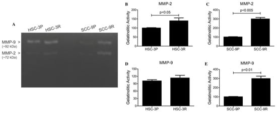 Figure 5. Zymographic analysis of supernatants of parental and resistant cells. (A) Representative image of the assay. Zones of gelatinolytic activities were detected at ~92 kDa and ~72 kDa, consistent with the presence of members of the gelatinase family MMP-9 and MMP-2, respectively. Optical densitometric quantification revealed significantly higher amounts of MMP-9 and MMP-2 in SCC-9R compared to SCC-9P, whereas there was only more of MMP-2 in HSC-3R cells. Values are expressed as the mean of optical density units relative to parental cells ± SD of 3 independent experiments. (B) MMP-2 quantification in HSC-3 cells, (C) MMP-2 quantification in SCC-9 cells, (D) MMP-9 quantification in HSC-3 cells, and (E) MMP-9 quantification in SCC-9 cells.
