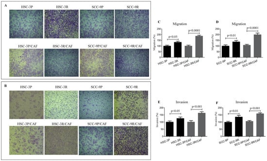 Figure 6. Cisplatin resistance is associated with increased potential for migration and invasion of OSCC cells. (A) Representative image for the transwell cell migration assay, and (B) the representative transwell cell invasion assay, using Myogel to cover the membrane pores of the inserts. Assays were performed with tumor cells alone or in combination with cancer-associated fibroblasts (CAFs). Quantification of the migrated HSC-3 cells is depicted in (C), and the migrated SCC-9 is depicted in (D). In (E), the quantification of the HSC-3 invasion is shown, and in (F), the invasion of SCC-9 cells. Values in graphics represent the mean ± SD of 3 independent experiments.