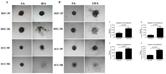 Figure 7. Cisplatin-resistant cells display increased migration and invasion in 3D spheroid models. (A) Representative images of the migration assay and (B) representative images of the invasion assay. Quantification of the 3D spheroid assays reinforces that resistant cells possess greater potential for migration and invasion than parental cells. The migration of HSC-3 cells and SCC-9 cells is depicted in (C) and (D), respectively, while their invasion is shown in (E) and (F), respectively. Values in graphics represent the mean ± SD of 3 independent experiments.