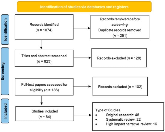 A total of 186 full-text articles were retrieved and evaluated against the predefined inclusion and exclusion criteria. Of these, 102 articles were excluded for reasons including: exclusive focus on acute pain models, peripheral nociceptive mechanisms without central involvement, publication in languages other than English, or insufficient methodological rigor (e.g., case reports or non-peer-reviewed commentary).