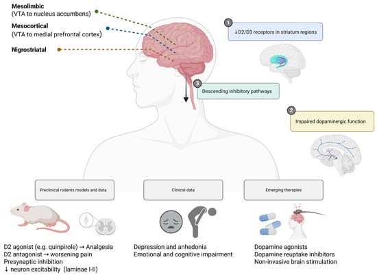 Emerging therapeutic strategies targeting the dopaminergic system (such as dopaminergic agonists, modulators of dopamine reuptake, and non-invasive brain stimulation targeting dopamine-rich regions) are under investigation and may offer novel approaches for patients with refractory pain syndromes, particularly those with prominent affective or cognitive symptoms [37,38]. Figure 2 summarizes the key anatomical pathways, experimental findings, and therapeutic targets associated with dopaminergic dysfunction in chronic pain.