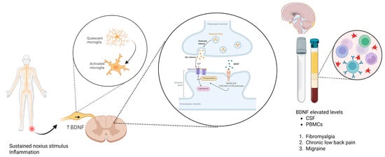 Elevated levels of BDNF have been consistently detected in the cerebrospinal fluid (CSF), serum, and peripheral blood mononuclear cells (PBMCs) of patients suffering from fibromyalgia, chronic low-back pain, migraine, and other persistent pain conditions [53,54]. These elevated levels are believed to reflect an upregulation of activity-dependent BDNF synthesis and release from primary afferent fibers and activated microglia, triggered by sustained noxious stimulation and inflammatory signaling. Notably, BDNF is transported anterogradely from dorsal root ganglion (DRG) neurons to central terminals in the dorsal horn, where it modulates excitatory neurotransmission [55].