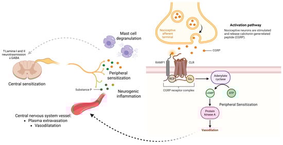CGRP, a 37-amino acid peptide derived from alternative splicing of the CALCA gene, is widely distributed in the trigeminovascular system and dorsal root ganglia [69]. It is one of the most potent endogenous vasodilators and a key player in inflammatory pain processes. CGRP acts through the CGRP receptor complex (composed of calcitonin receptor-like receptor and receptor activity-modifying protein 1) to induce smooth muscle relaxation, promote vasodilation, and enhance immune cell recruitment via cytokine release [70]. In peripheral tissues, CGRP increases vascular permeability and sensitizes nociceptors by lowering their activation threshold, contributing to hyperalgesia and allodynia [71].