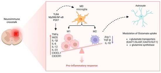 Microglia, the resident immune cells of the CNS, respond rapidly to pathological stimuli such as nerve injury, inflammation, or tissue damage. Upon activation, microglia undergo phenotypic transformation and release a range of pro-inflammatory mediators, including tumor necrosis factor-alpha (TNF-α), interleukin-1 beta (IL-1β), interleukin-6 (IL-6), and various chemokines such as CCL2 and CXCL1. These signaling molecules act on nearby neurons to enhance excitability, lower pain thresholds, and disrupt inhibitory neurotransmission, particularly in lamina I and II of the spinal dorsal horn [82,83]. Astrocytes, although activated later than microglia, contribute to the maintenance phase of chronic pain through the release of similar pro-inflammatory cytokines and modulation of glutamate uptake, which further intensifies neuronal hyperexcitability [84].