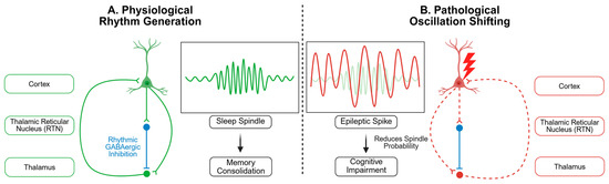 The Thalamocortical Circuit in Health and Disease. (A) During normal sleep, thalamocortical circuits generate spindles to support memory consolidation. (B) In epilepsy, this same circuit is hijacked by pathological spikes, which competitively suppress spindle generation and impair cognition.