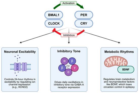 Brain-derived neurotrophic factor (BDNF), a crucial regulator of neuronal survival and plasticity, exhibits a robust circadian regulation that is disrupted during epilepsy. Circadian oscillation of BDNF is controlled by CLOCK-BMAL1 binding to E-box elements in the BDNF promoter [53]. In epilepsy models, circadian BDNF regulation is lost, potentially contributing to the neuronal hyperexcitability and impaired plasticity observed in epilepsy.