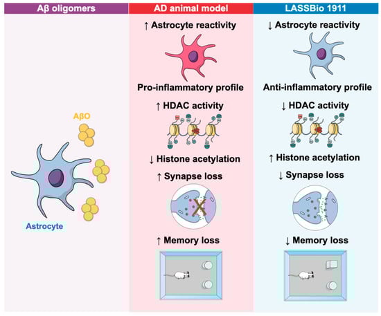Recently, our group described a new HDAC6 modulator with therapeutic potential for the AD model. We demonstrated that the novel HDAC inhibitor, LASSBio-1911, inhibited HDAC activity and increased acetylated histone levels in the hippocampus of animals infused with amyloid-β oligomers. Moreover, LASSBio-1911 reversed inflammatory cytokine levels, reduced astrocyte reactivity, and enhanced the neuroprotective potential of astrocytes. LASSBio-1911 also rescued cognitive deficits and synaptic loss induced by amyloid-β oligomers (AβO) in mice (Figure 2) [57]. These findings demonstrate its great potential in mitigating the deficits observed in amyloid-β pathology.