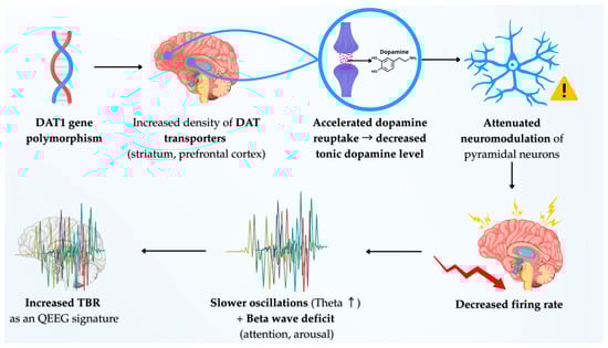The polymorphism of the dopamine transporter gene provides a key example of the gene-protein-EEG nexus. Variants of this gene that lead to an increased density of DAT transporters in the striatum and prefrontal cortex result in an accelerated reuptake of synaptic dopamine [27,40]. At the cellular level, this reduced tonic dopamine level diminishes the neuromodulation of pyramidal neurons in the prefrontal cortex. This may, in turn, result in lower neuronal firing rates and a propensity for slower, less organized oscillations characteristic of the Theta band [28]. Concurrently, a deficit in the Beta band, which is associated with sustained attention, can be viewed as a direct consequence of insufficient dopaminergic stimulation required to maintain a state of high cortical arousal and engagement [41]. Thus, an elevated Theta/Beta Ratio (TBR) can be hypothesized to represent not merely a statistical anomaly, but a direct electrophysiological signature of molecular inefficiency within the dopaminergic system, potentially originating from polymorphisms in the DAT1 gene. This relationship is visually represented in the following Figure 1, which illustrates the full neurobiological cascade in ADHD, from genetic polymorphism to the electrophysiological signature.