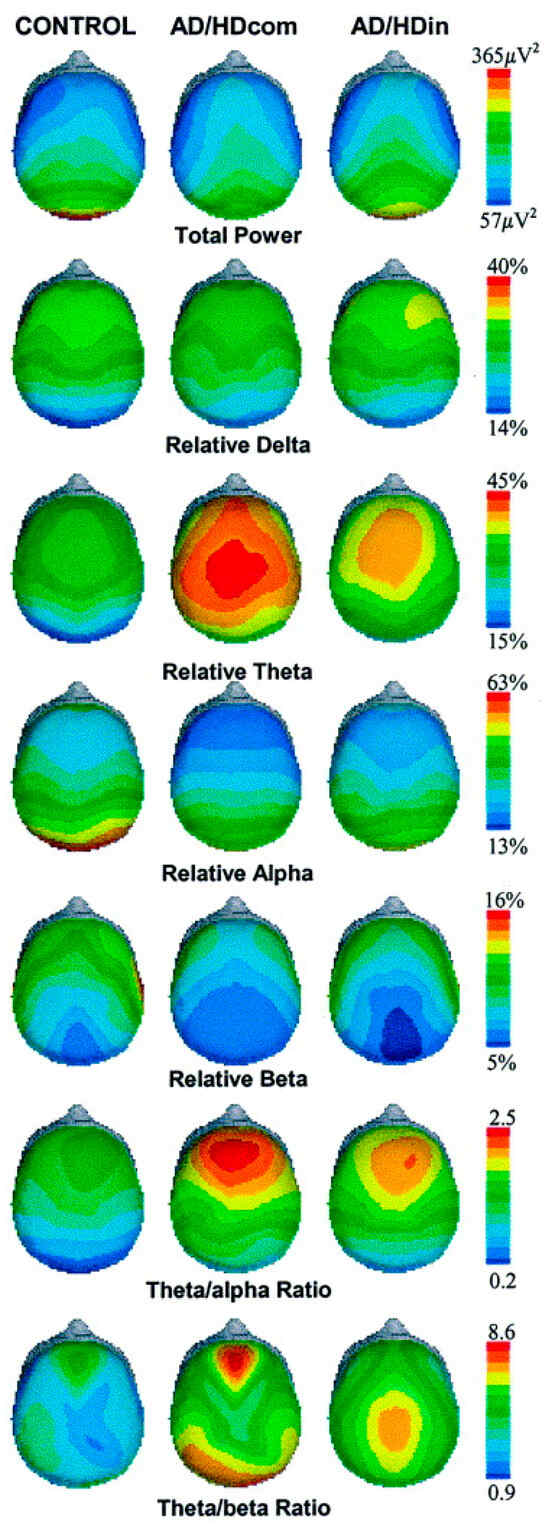 Topographical brain maps illustrating the differences in bioelectrical activity between the control group (left column) and ADHD subtypes: combined (middle column) and predominantly inattentive (right column). Compared to the control group, patients with ADHD, particularly in the combined subtype (AD/HDcom), show a distinct excess of relative Theta power in the frontal regions (indicated in red). This leads to an elevated Theta/Beta ratio, which is considered a key neurophysiological correlate of ADHD symptoms. Figure adapted from Barry et al. (2003) [54].