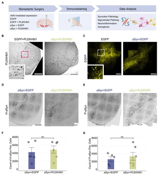 Since alterations in PLEKHM1 expression levels, in either direction, were linked to neurodegenerative diseases and the lack of PLEKHM1 impairs the autophagy–lysosomal pathway, we were interested in the impact of PLEKHM1 overexpression. We hypothesized that PLEKHM1 overexpression modulates autophagic clearance—either by facilitating or impairing it—thereby potentially affecting αSyn pathology and providing insights into disease mechanisms and the functional relevance of genetic evidence. To assess whether increased PLEKHM1 levels in mouse neurons affect αSyn-induced toxicity, we utilized a recombinant adeno-associated vector (rAAV) to transduce PLEKHM1. The rAAV was stereotactically injected into the substantia nigra (SN), alongside a separate rAAV overexpressing the pathogenic A53T mutant of human αSyn [18]. The increased expression of monomeric αSyn causes familial variants of PD [19,20]. Additionally, PLEKHM1 was transduced in transgenic autophagy reporter mice to examine the impact of PLEKHM1 overexpression on the autophagy–lysosomal pathway under physiological conditions.