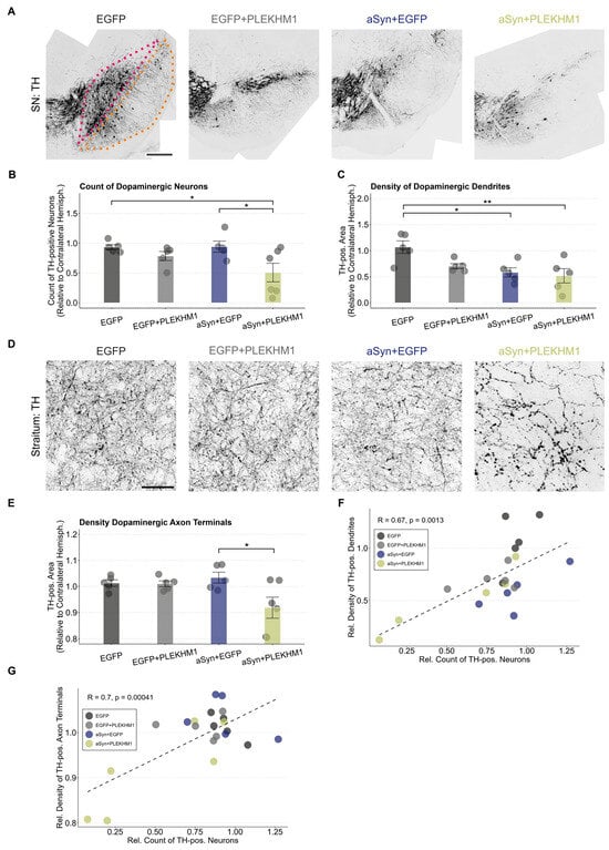 The integrity of dopaminergic axon terminals was assessed by measuring the density of TH-positive structures in the striatum using images acquired at high magnification (Figure 2D). Regarding the neuron numbers in the SNc (Figure 2B), the co-expression of αSyn and PLEKHM1 reduced the density of TH-positive axon terminals in the striatum, whereas the individual expression of either αSyn or PLEKHM1 did not (Figure 2E).
